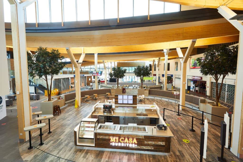 At Leeds Skelton Lake, which was developed in 2020, we aimed to deliver an entirely different concept to convention service areas. The design utilised mass timber in conjunction with steel frame for a hybrid structure. This provided a unique aesthetic with 142 exposed glue-laminated timber beams.